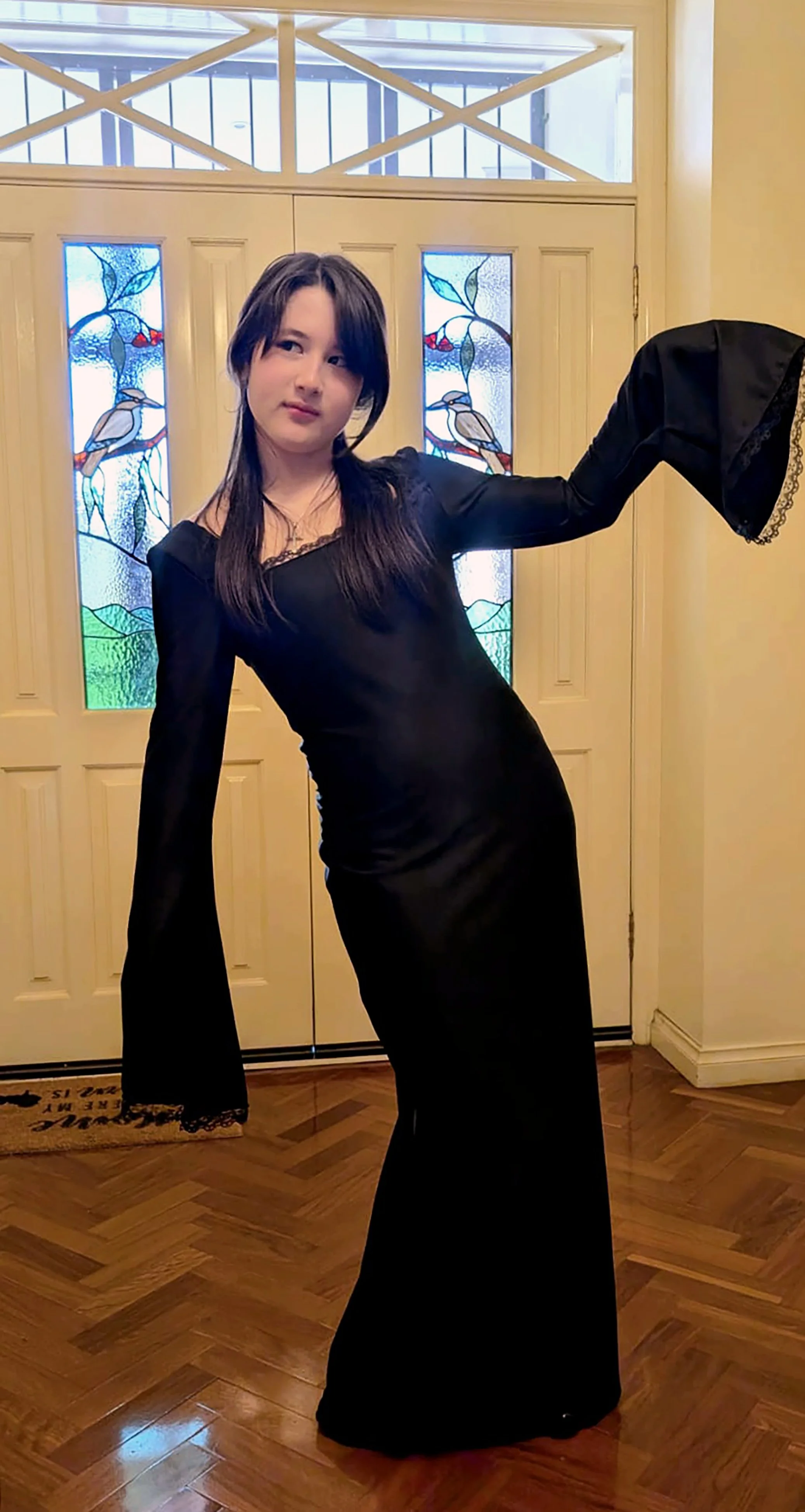 In this update, we are highlighting Kiona McG (11I) and her exceptional creations. Kiona created her own pattern for her elegant black dress including the chain embellishment at the back of the garment making the dress unique. The denim bag is made from recycled jeans and hand embroidered as a celebration of cultures including a salute to Australia with 2 kangaroos jumping along the band.